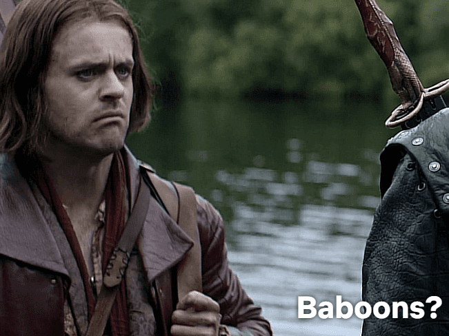 In the English translation however, those “gorillas” somehow became baboons. The wordplay vanished, and the scene turned absurd. As if the peasants got confused about the species of the monkeys not the word 'guerillas'. And Netflix, relying on the English text, copied this straight into their adaptation.